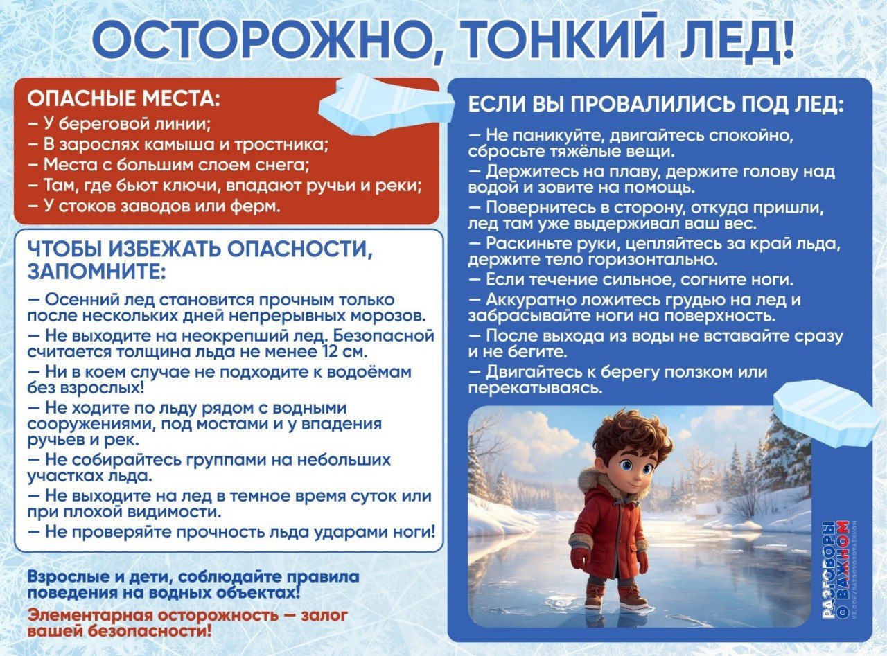 Неокрепший лед в сочетании с сильными метелями может представлять большую опасность для жизни людей, пренебрегающих элементарными правилами поведения на водоемах. В целях обеспечения Вашей безопасности установлены периоды, запрещающие выход на лед. Нахождение на льду в это время часто связано со смертельным риском. Особой опасности подвергаются дети, оказавшиеся на льду без присмотра взрослых. Еще одна категория риска – любители активного отдыха и зимней рыбной ловли, которые устремляются на лед, едва только он успеет установиться, но неоправданная удаль и азарт нередко способствуют потере у людей чувства самосохранения.