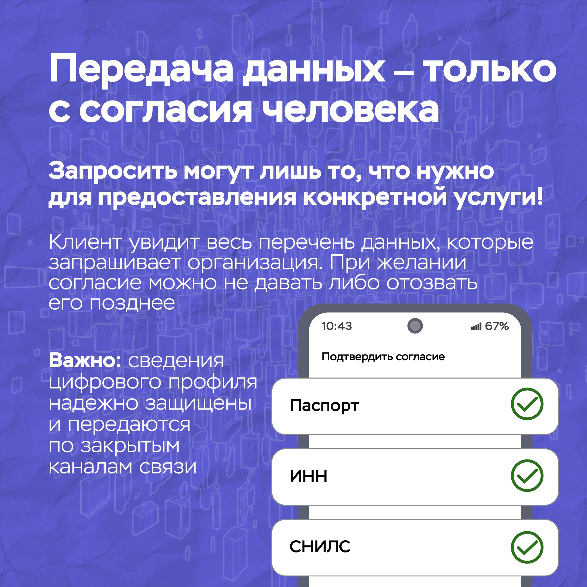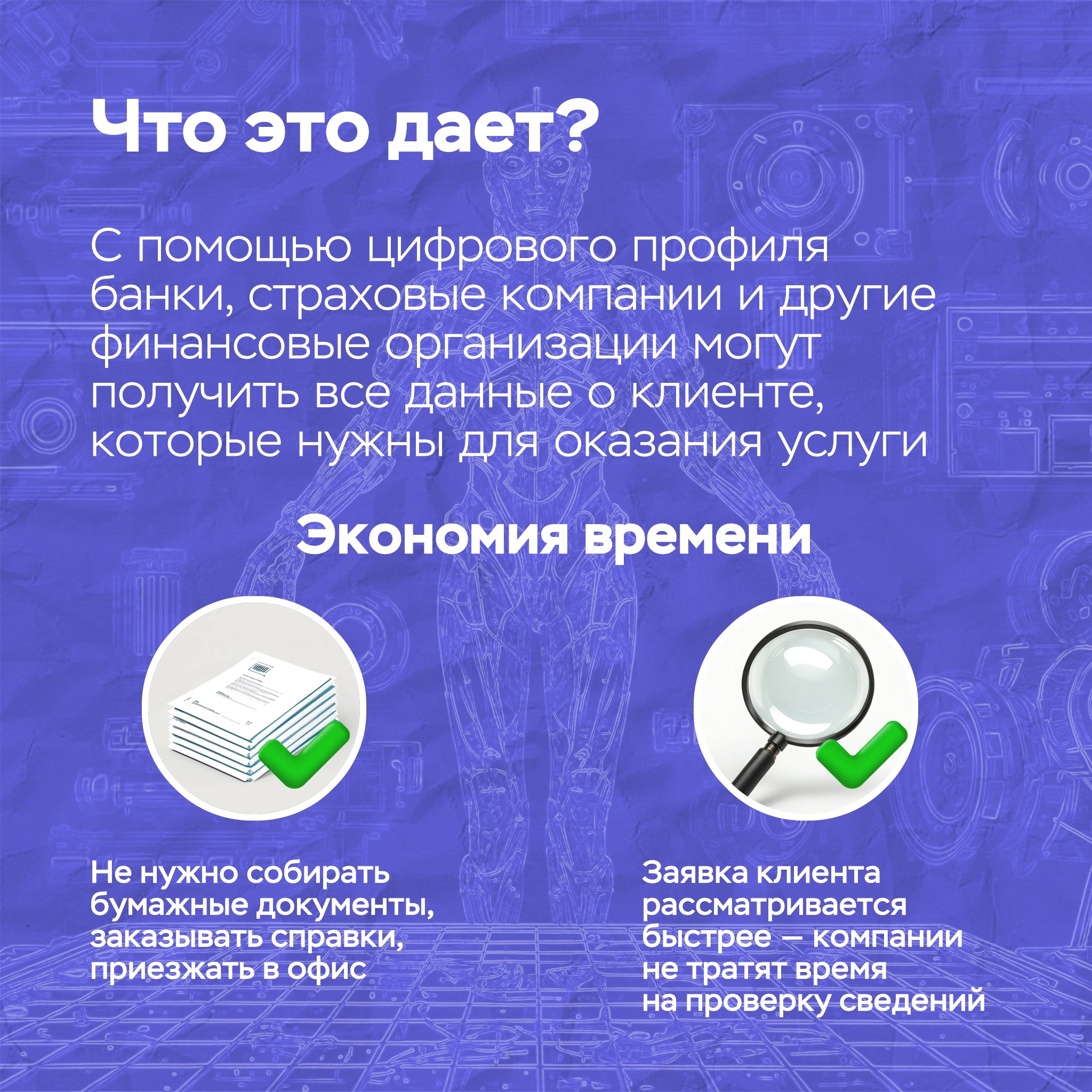 Современные технологии делают жизнь проще и комфортнее. Нужно быстро оформить страховку, а документов под рукой нет? Поможет цифровой профиль. Что это за сервис, как он работает – рассказываем в карточках.