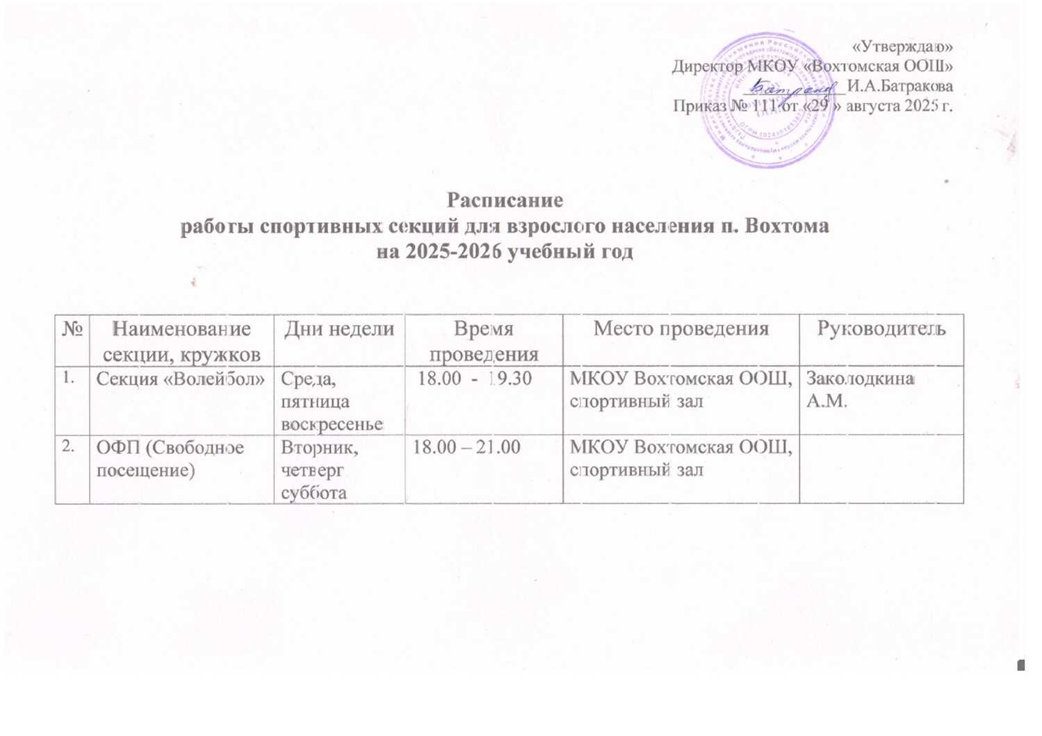 Расписание спортивных секций для взрослого населения на 2025-2026 уч.год